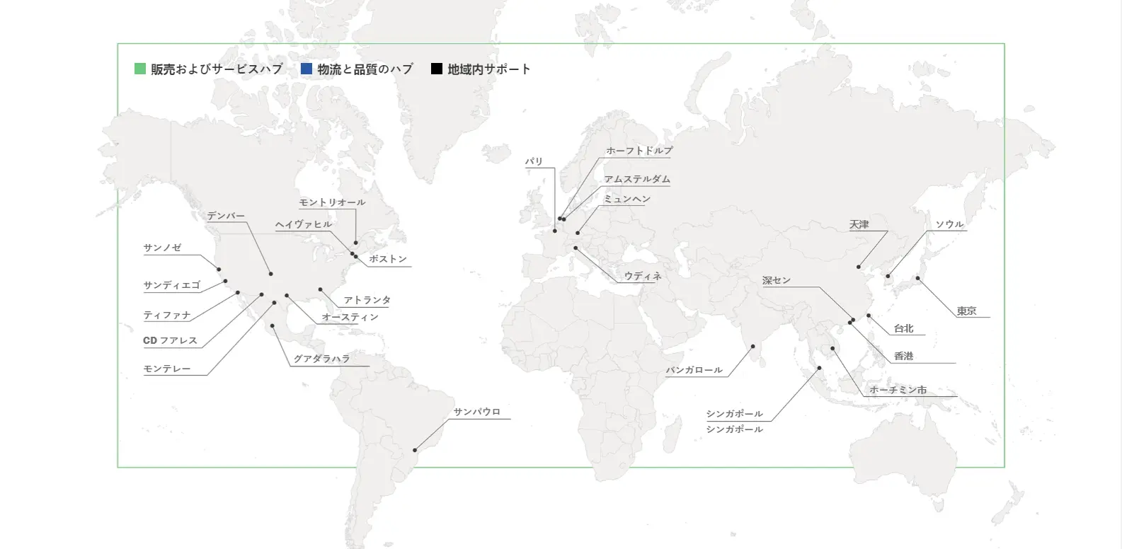 | 各地域本社 | 米州: ボストン アジア太平洋: シンガポール 欧州・中東・アフリカ: アムステルダム 世界各地域に19箇所の拠点を持つ |